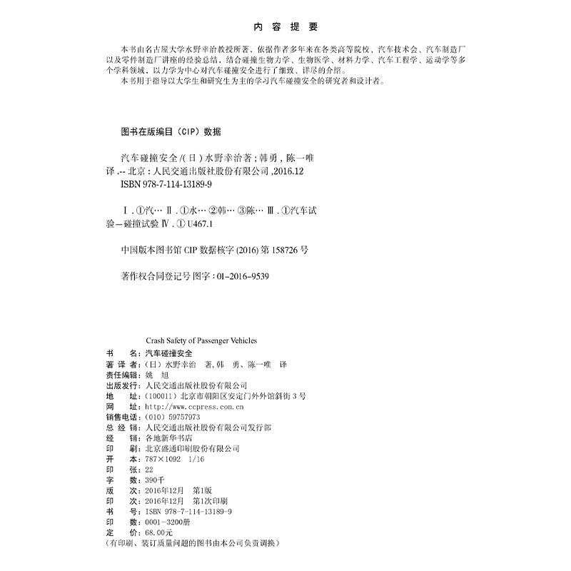 《汽车碰撞安全》由名古屋大学水野幸治教授所著,依据作者多年来在各类高等院校、汽车技术会、汽车制造厂以及零件制造厂讲座的经验总结,结合碰撞生物力学、生物医学、材料力学、汽车工程学、运动学等多个学科领域,以力学为中心对汽车碰撞安全进行了细致、详尽的介绍。